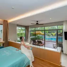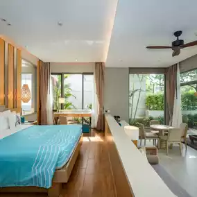 Villa, a private villa with a good size, next to the swimming pool. You can open the balcony and jump into the pool. The balcony is very spacious. The room is also