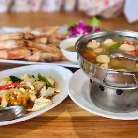 Huai Sai Kitchen is a large restaurant with lots of seats. It can accommodate many tour groups. There is a lot of parking space and many staff. The queue is very professional. Even though this restaurant has a lot of people, the food comes out quickly. Some things are slow. You have to ask, but when you follow up, you get it. Another important thing is that you don't have to order rice. It's free for every table. This restaurant's highlight is the taste. It's a Bangkokian taste. It's not as sweet as in Phetchaburi. I personally like this restaurant. It's suitable for bringing your family to eat here often.