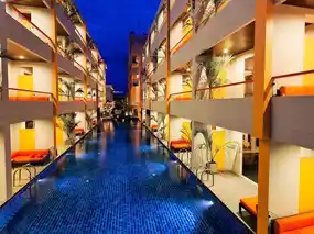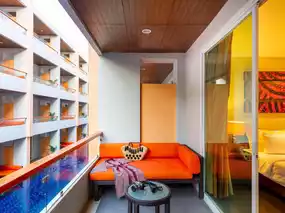 FuramaXclusive Sandara Hua Hin (โรงแรมฟูราม่า เอ๊กซ์คลูซีฟ แซนดารา หัวหิน) is a 4-star hotel ideal for a seaside getaway, especially for families with children. The hotel offers kid-friendly rooms, a kids' club, a playground, a sand play area, and a swimming pool with a slide for children to enjoy. The hotel has 122 rooms, including Superior Rooms, Deluxe Rooms, and Stylish Pool View Rooms, as well as Pool Access Rooms with balconies that connect directly to the pool. Room amenities include a digital safe, direct dial telephone, LCD TV, CD player, free Wi-Fi, minibar, bathrobe, slippers, toiletries, and a hairdryer. The hotel also features The rest@sea restaurant, which serves international and Thai cuisine. For relaxation, there is a fitness room and a sauna. The beachside lobby lounge offers drinks and snacks. Staying at FuramaXclusive Sandara Hua Hin guarantees a beautiful, clean, and convenient experience with excellent service. Additionally, the hotel is just a 5-minute walk from the Nang Lay Music Festival venue.