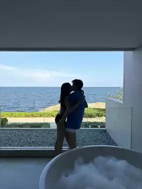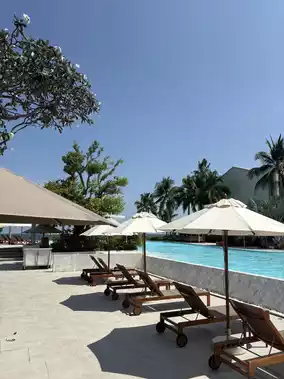 Vala Huahin - Nu Chapter Hotel is another popular hotel that should be on your list when visiting Hua Hin. The hotel is decorated in a white marble pattern and offers various room types to choose from. The hotel is quite spacious with plenty of areas to walk around. It is located right on the beach. The central swimming pool is excellent, very large and long. In the evening, many people come down to swim. There is also a buy 1 get 1 free drink promotion in the evening. The breakfast is very good with a wide variety of options, almost international. There are Thai, Western, and Japanese dishes, all delicious. I especially like that they have a Khanom Jeen (Thai rice noodles) menu. This is one of my favorite hotels. If you come to Hua Hin, you must stay here.
