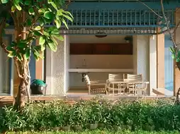 .. A small resort with only 8 houses. Inside the resort, there is a garden with green trees and lawns that make it look shady. Even during the day, it is not hot at all.