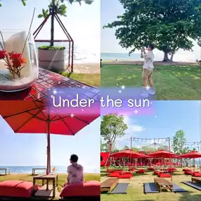A secret cafe in the Bangsaen area. There are camping accommodations. There are rocks in the middle of the sea with beach chairs for cool photo spots.