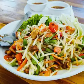 😍 "Chomview Seafoods Hua Hin" restaurant is a seafood restaurant located on the beach of Hua Hin. The atmosphere of the restaurant is open-air, allowing you to see the beautiful view of the sea in Hua Hin. The restaurant offers a variety of dishes to choose from, including fresh seafood and spicy Thai food. The restaurant's recommended dishes include grilled river prawns, fresh oysters, pickled crab eggs in fish sauce, and thick seafood tom yum. The restaurant's food is delicious, fresh, and inexpensive. In addition, the restaurant also has live music in the evening, making the atmosphere of the restaurant lively and fun. It is suitable for dining with family, friends, or loved ones.