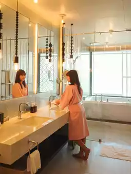 The bathroom has a double-sided design and a bathtub with a sea view.