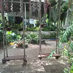 The atmosphere is like being in a garden house. There are shady trees and seats in the garden. The green atmosphere is pleasing to the eyes. It is perfect for escaping the heat. Sit under the shade of the trees and turn on the fan for a bit. It is cool and comfortable. Sitting and sipping a cold drink is even more enjoyable.
