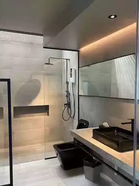 We stayed in the Sea View Jacuzzi room on the top floor, which was spacious. There was a Jacuzzi on the balcony with a panoramic sea view. The room was simply decorated, clean, and had a TV, refrigerator, Wi-Fi, and a hair dryer. The highlight is privacy, quiet, and no noise.
