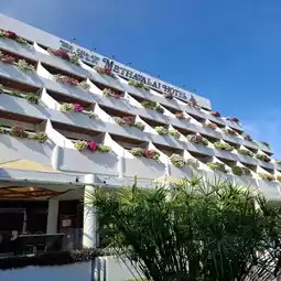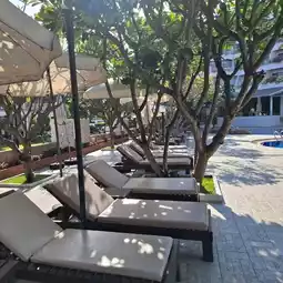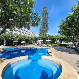 🏖The hotel area is spacious. There is a green lawn in front of the hotel that is easy on the eyes. There is an outdoor pool in front of the lobby. The water is clean and inviting. There is a security guard. There are frangipani trees around the pool, adding to the beautiful atmosphere.