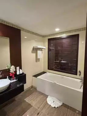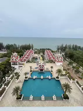 Anyone looking for a place to stay by the sea or with a sea view from their room, this is it #grandpacificsoverinandspa The room is very spacious. There is a bathtub for swimming. There are 3 swimming pools, both a children's pool and an adult pool. On the day we went, there was also a fun activity to join in by making coconut pancakes. When you're done, you can eat it by the pool to cool down. The breakfast is also well-made. There is a small selection of food, but the taste is okay. 🏖️Environment/Facilities: Parking, Kids Club