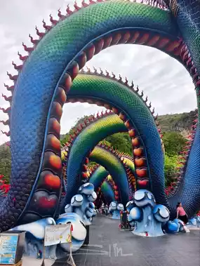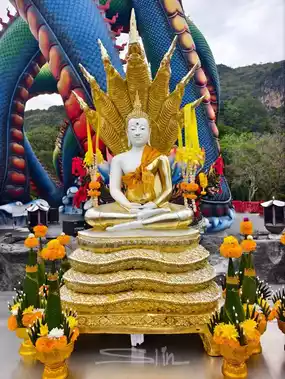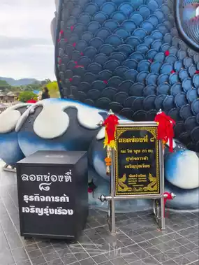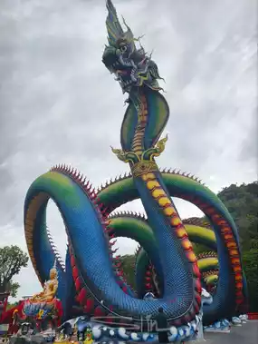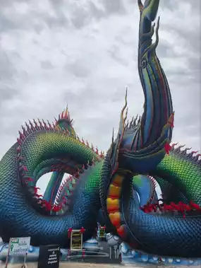 Another Naga located in Phetchaburi Province is considered the largest Naga in Thailand. It is considered a new landmark of Phetchaburi Province and is very popular among the spiritualists who travel to worship and request blessings from “FatherPhraPhraPhetKiri Mahamuni Srisutthonakraj”, the first Naga in Phetchaburi and the largest in Thailand. It is about 31 meters high, with a diameter of 2 meters, and a body length in the shape of an Unalome talisman. There are 9 holes to pass through, and it is 227 meters long. It is indigo-colored or the green color of a beetle’s wings, making it beautiful and magnificent.