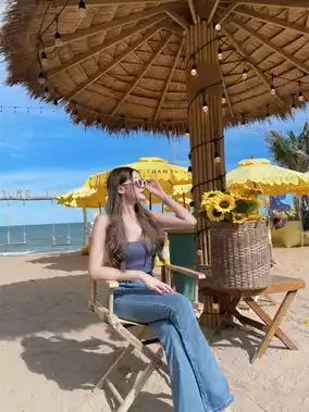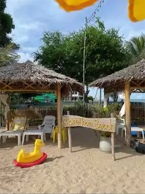 It's a cafe with a white duck 🪿 running cutely along the beach.