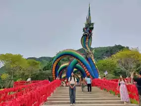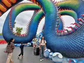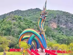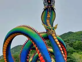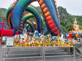 This temple is home to the first and largest Naga statue in Phetchaburi Province, making it the biggest in Thailand. It has become a new landmark for devotees of the Naga spirit and spiritual seekers. The statue is beautifully designed with vibrant colors and an awe-inspiring yet not intimidating appearance. The scales of the Naga shimmer in a metallic blue-green hue, resembling the wings of a jewel beetle, especially when sunlight hits it, creating a stunning visual effect. The temple also offers spacious parking and is easily accessible. Don't miss out on visiting this remarkable site!
