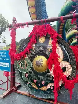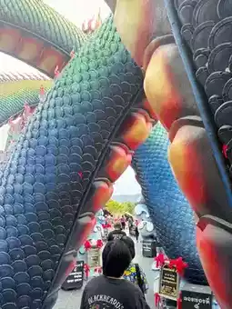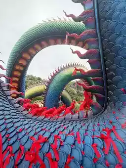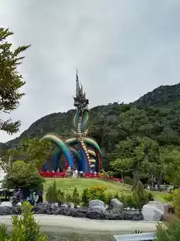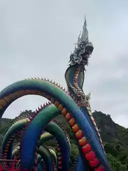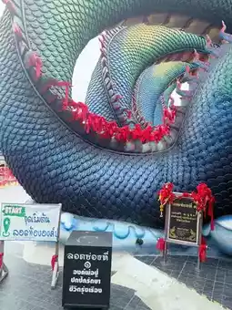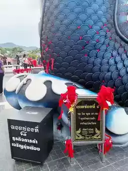 For those planning a trip to Phetchaburi Province, we recommend a new and popular landmark, "Phra Pu Phaya Phet Khiri Mahamuni Sri Suttho Nakarat," the first Naga statue in Phetchaburi and the largest in Thailand. It features nine passageways and is 227 meters long. Its sapphire-colored, or the green of a beetle's wings, creates a three-dimensional effect, thanks to its delicate structure, exquisite patterns, and beautiful and magnificent coloring. The temple is newly built and has a parking lot and clean restrooms. The view is excellent, but it's quite crowded.