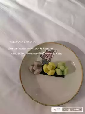 🧁 After dinner, I went back to my room and saw a plate of cute Thai desserts on the bed, and the bed was made.