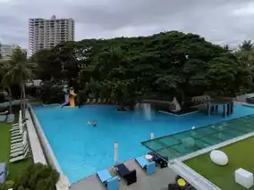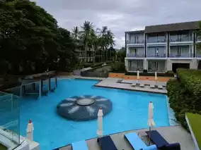 The hotel is not very large but is well-designed. The large trees by the seaside pool provide shade and create a pleasant atmosphere, making it a great spot to relax all day.