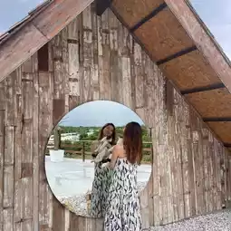 The cafe is decorated in a "Farmhouse + Loft" style, using wood and exposed concrete. There are round mirrors and striking photo spots on the second floor.