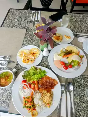 If you wake up a bit late, you might have to wait in line for breakfast because it's really crowded. The staff provided excellent service. Overall, it was good.
