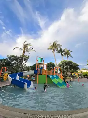 The swimming pool has both adult and children's areas.