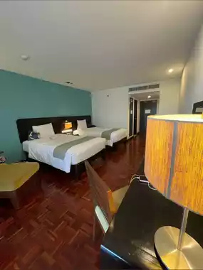 The room didn't include toothbrushes, toothpaste, or slippers. It's quite a walk to the children's pool and gym. The hotel layout is spacious and the food is delicious.
