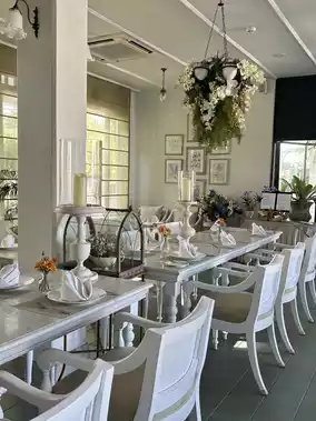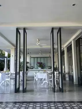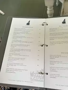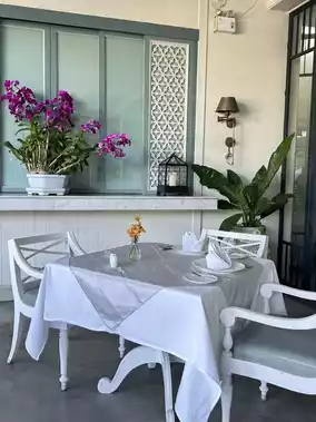 Pribpri Restaurant, located in the Devasom Hotel in Cha-am, Hua Hin, is located a short distance down an alley. There's on-site parking and a short walk away. There are receptionists. There are two zones: air-conditioned and non-air-conditioned. The atmosphere is incredibly refreshing and natural, with views of the ocean in the distance. The restaurant's interior is beautifully decorated and inviting. Their signature dish is the 🌾 Royal Khao Chae (Khao Chae) for 450 baht per set. It's delicious and features carved champaka flowers from turmeric. It's incredibly refreshing.