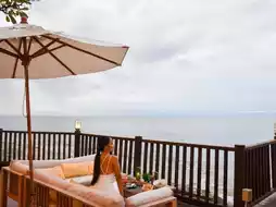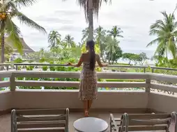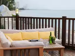 There is a sofa to sit on, a balcony with a view of both the sea and the swimming pool. On the balcony, there are chairs to sit and relax.