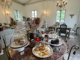 Beautiful cafe, white vintage style shop, with a small English garden and lemon garden inside. The shop is well decorated, clean white tones. When you walk in, there are tables with various kinds of desserts to choose from from the entrance. And let me tell you, it's not just beautiful photos, but the desserts and drinks here are just as good. There are both indoor and outdoor areas, with corners set up for photography lovers.