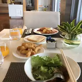 ✨ Highlights - The room is spacious, the bed is soft, the smart TV can watch YouTube, and most importantly, there is a table for putting on makeup (which we really like). The bathroom has a bath tub and clearly separates the wet and dry areas. There is also an iron provided. As for the breakfast line, there is a lot, both Thai and international styles. I recommend the noodles, they are very delicious. Let's just say it's worth the price and is worth the five-star status. Oh! And there are many photo spots.