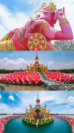 ถัดมาไม่ไกลคือ “วัดสมานรัตนาราม” ที่มีพระพิฆเนศปางนอนเสวยสุขขนาดใหญ่ที่สุดในประเทศไทย สีชมพูสดใสสะดุดตา รายล้อมด้วยเทพเจ้าหลายองค์จากหลากวัฒนธรรม ทั้งไทย จีน และฮินดู เป็นสถานที่ที่ผสมผสานความเชื่อและศิลปะได้อย่างลงตัว