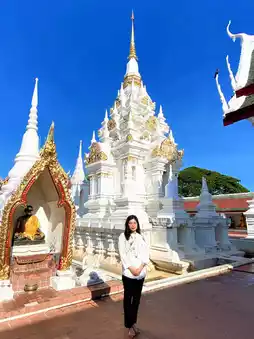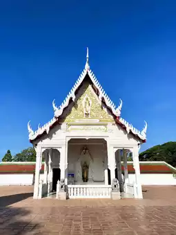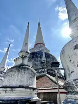 Phra That Chaiya is a Srivijaya-style pagoda from around the 13th-18th Buddhist centuries. The white pagoda is majestic, surrounded by small pagodas and a balcony around the pagoda. It looks very peaceful and powerful.