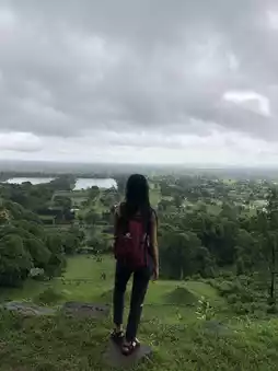 The temple is structured in tiers ascending along the hillside, with a pathway lined with stone pillars leading to the main sanctuary at the summit. Upon reaching the top, visitors are rewarded with a stunning panoramic view.