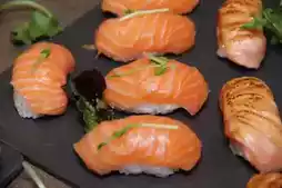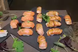 There are mini sashimi bowl bacon, prawns, scallop sliced