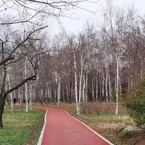 - In the park, there is a big pond, a pine forest, and many big trees. It's very shady. We saw a lot of local people exercising.