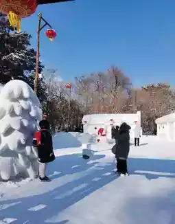 The "Green Mountains and Clear Waters" lantern group is located at the Bronze Crane Square. With Changbai Mountain ginseng as the core element, it incorporates mountain and water scenery, conveying a beautiful vision of environmental protection, longevity, good fortune, and peace. The surface of South Lake has become a natural ice rink. Stroll along the lake and slide on the ice for endless fun.
