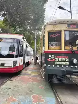 The Route 54 tram stops in front of the Changchun Film Studio on Hongqi Street. Just as we arrived, two vintage Route 54 trams were parked. Research reveals that the Route 54 trams, in operation since 1941, are nearly a century-old relic of Changchun. Their dark green carriages and wooden seats create a truly retro feel, and compared to the newer Route 54 trams next to them, they offer a more timeless aesthetic.