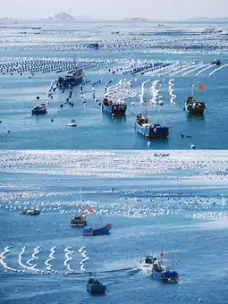 4⃣Sea Ranch: Looking around, the blue sea is dotted with tens of thousands of white buoys floating on the sea, which is very spectacular. The sea is surrounded by countless fishing boats, which are moored in the offshore in an orderly manner, swaying with the sea breeze from time to time.