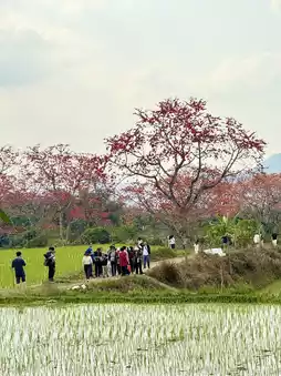 The terraced fields, like an oil painting, are even more stunning with the blooming kapok flowers on the mountains full of kapok trees