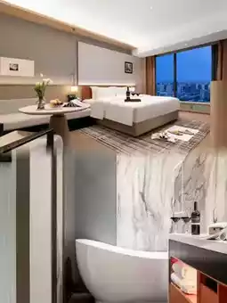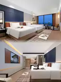 The hotel has a stylish new Chinese design that incorporates the historical site of Aiwan Pavilion, one of the four famous pavilions in Changsha. It has a rich history and a beautiful, comfortable environment. You can see the beautiful Yuelu Mountain from the window, and at night you can see the beautiful night view of the Xiang River!