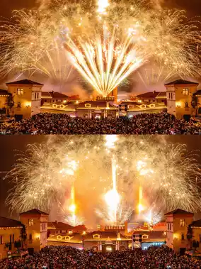 The Italian-style movie town, with fireworks blooming like a romantic movie ending, offers a visual and auditory feast with fireworks accompanied by music.