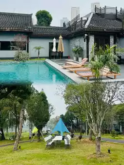 - Located on a private island within Yanghu Wetland Park, surrounded by natural lakes, the resort is a natural oxygen bar in the bustling city. From an aerial view, the crystal-clear lake water resembles a moat encircling the academy-style buildings with their turquoise tiles and black eaves, showcasing the beauty of classical Chinese architecture.