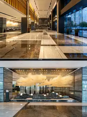 As you enter the lobby, you will see the tall space with double-sided floor-to-ceiling windows, which integrate the indoor and outdoor spaces, providing ample light and a wide view. The low-key colors and central art area design create a high-end and elegant visual atmosphere.