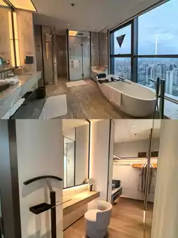 - Pros: Stayed in an open-concept corner room on the 45th floor (62m²) with excellent views, featuring floor-to-ceiling windows on two sides, abundant natural light, smart toilet, JBL speakers, wireless charging, and other comprehensive amenities. The comfortable bedding and room decor combines light wood with marble, creating an elegant business atmosphere.