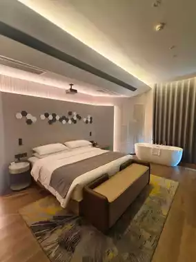 🛏️The room deserves special praise!! Spacious and immaculate, flooded with sunlight for a bright ambiance. The bed's perfect firmness even had this light sleeper resting soundly~ Mini-fridge and projector are super handy, making extended stays as comfy as home! 🆓Free parking, gym, and laundry facilities cater perfectly to both business trips and vacations.