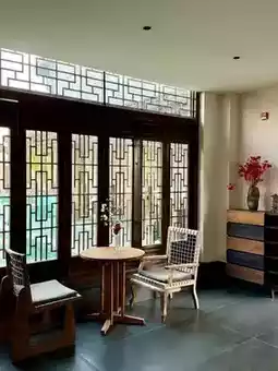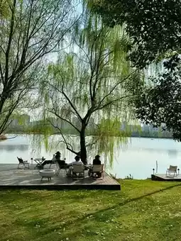 Step into this tranquil space, where traditional Chinese lattice windows resemble the warp and weft patterns on ancient silk, filtering sunlight that casts an elegant glow on the raw wood tables and rattan chairs. Delicate floral arrangements on the desk quietly evoke the poetic sentiment of Song and Ming literati: "Sitting quietly, one finds leisure in the company of flowers." Ascending to the second-floor corridor, the space plays with the interplay of solid and void through Chinese-style grilles, unfolding like an ink-wash scroll. Antique furniture stands quietly, like old friends inviting visitors to pause their worldly cares, sit and watch the curling tea steam, and reminisce the refined elegance of bygone eras: "As evening falls and snow threatens, won't you share a cup with me?" Stepping outdoors, willow tendrils sway, brushing ripples across the mirror-like lake, scattering reflections of sky and clouds. People gather under the trees, their shadows stretching like seal script, while the city's clamor fades into distant music. Here, time slows like moss creeping over stone steps, allowing one to "steal a half-day of leisure from life’s busy schedule" with peace of mind, rediscovering the Eastern way of life diluted by urban hustle amid the willows and breeze.