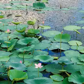 Strolling along the winding paths, you can deeply appreciate the beauty of nature. At this moment, a few dragonflies dance above the lotus flowers, adding a lively touch to this picturesque scene.
