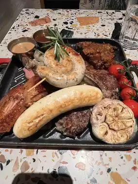 I ordered a meat platter with spiral sausages, tender steak, and crispy roasted chicken… paired with two kinds of sauces, every bite hit the spot 🤤! The craft beer is the soul of the place—the malt aroma bursts on the tongue, rich yet refreshing. Sitting at the bar watching the bartender’s skilled moves, sipping a drink, the fatigue of work instantly melts away~