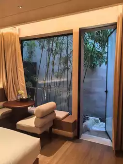 As soon as I stepped into the courtyard, I was amazed by the bamboo scenery and the aroma of tea! Wabi-sabi style blended with new Chinese design, raw wood furniture paired with semi-transparent bamboo curtains, sunlight filtering through leaves onto the tatami tea mat – every casual shot turns into an atmospheric masterpiece. The "Peiyu" room type I booked is absolutely stunning. During the day, you can watch the bamboo grove sway, and at night, you can overlook the city skyline while soaking in the bath. After closing the window, the soundproofing is so good that you can't hear any noise from outside the alley [__LINK_ICON].