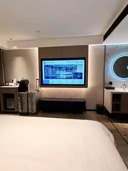 The room setup is modern, cozy, and smart. There’s a Xiaodu voice control system that lets you adjust lights, curtains, and even the TV with just your voice, a real upgrade for a hotel at this price point. On top of that, they even provide an Aircon remote so you can control the temperature without getting out of bed (lazy travelers like me, you’ll love this 😆).