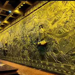 A 360-meter long art gallery corridor, styled with classical garden elements, carved beams, and gold-roof pavilions. Every step reveals a new scene.