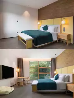 The entire hotel has a construction area of nearly 10,000 square meters, which is rare in the entire Huajiantang series of hotels. Ten miles of green mountains are half in the city, and 10,000 acres of green waves surge to the west gate.