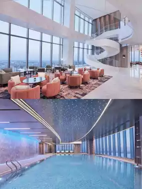 For dining, four sky restaurants and lounges are located on the 36th to 38th floors, offering Jiangsu and Zhejiang local cuisine, creative teppanyaki, and more. Additionally, the hotel features a 24-hour fitness center, a sky pool, and over 2,415 square meters of banquet space to meet guests' leisure and business needs.