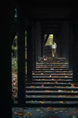 Walking on the wooden boardwalk covered with fallen leaves,